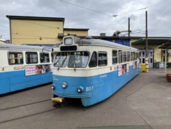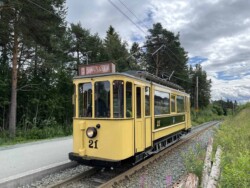 We arrived a day ahead of the VDVA group and had our own charter (private hire). We requested one of the interurban trailers for photos only as our group was rather small (5 people). Also the rarely used two axle car 21 (built in 1914) of the town system was used for a ride from the depot to the outer terminus (it was not used next day by the group). Only the “interurban” Grakallbanen survives – the city lines were closed in stages up to the late 1980s. Today it is called line no.9. Next day the VDVA group arrived and we were about 35 people total then (a few more joined us from Bergen onwards).